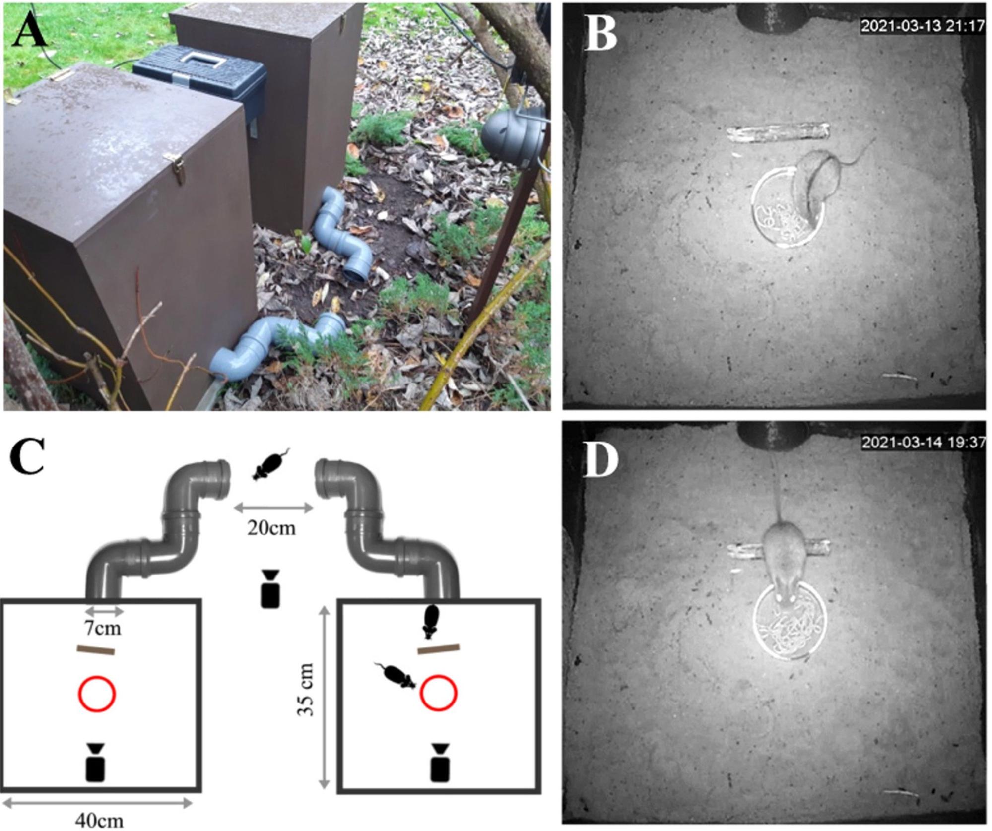 The study took place during winter, from mid-January to late March 2023, in a peri-urban landscape near Warsaw, on private land adjacent to forest and meadows.The chambers were pre-baited for about one and a half months before the experimental period.Each chamber was a wooden box with a plastic pipe entrance, monitored around the clock with infrared cameras and motion-triggered video recording.The setup is shown in Figure 1 on page 27, including the paired chambers, the two mouse species, and example chamber footage.The bait choice was not subtle. Each chamber received ten grams of chocolate-nut cream spread on a Petri dish every day after dusk.In winter conditions, that level of palatability matters. The chambers also provided cover from weather, and the paper explicitly notes that their attraction persists even without food because they function as a windbreak and are warmer inside than outside.To control the scent presentations, the team used standardized birch scent probes placed near the food bowls.Predator treatments used fresh fox and cat scent mixtures. A deer scent served as a non-predator animal control, and there were also wet and dry procedural controls.Scents were rotated across chambers using a Latin square structure so that animals always had a choice between one chamber containing an animal-derived or procedural treatment and another chamber containing a water-based control.This matters because the experiment was not merely “predator scent versus nothing.”It was a choice test in which all chambers remained attractive for reasons unrelated to scent.The mice were free to enter or ignore the chambers.The design therefore asked a more realistic but also more complicated question: what do wild mice do when risk cues are embedded inside a shelter-and-food opportunity during winter?